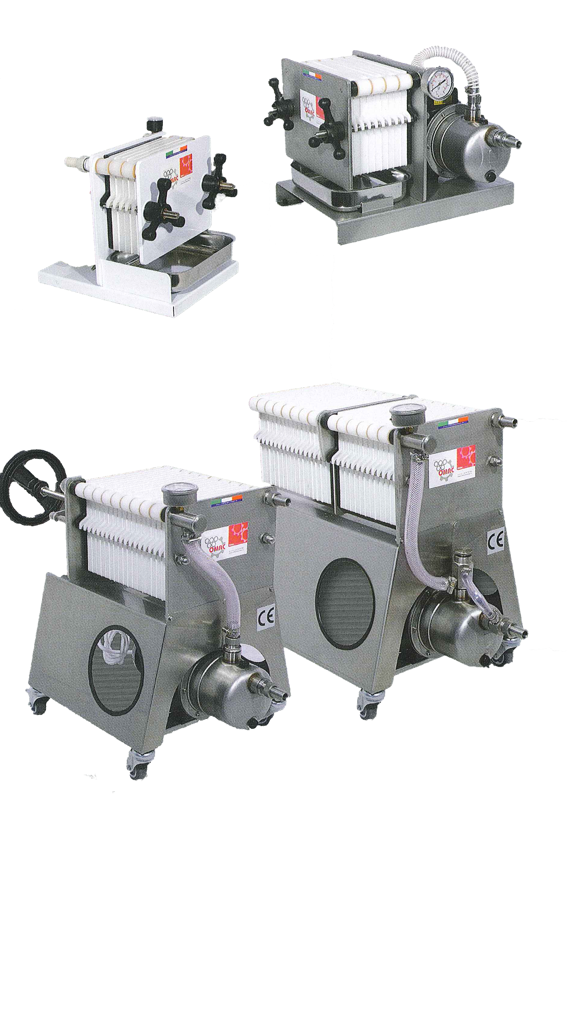 Appositamente studiati per soddisfare le esigenze delle piccole e medie aziende. Costruiti in acciaio inox, pratici e sicuri. A seconda dei tipi di strati filtrati usati, essi consentono di sgrossare, brillantare e sterilizzare gli olii d'oliva. La serie di filtri è composta da apparecchi con capacità di filtraggio a prestazione elevate. Vengono montate pompe del tipo monovite o a girante in nitrile. Le piastre di supporto da 20 x 20 cm. e 40 x 40 cm. sono in plastica per alimenti o a richiesta in NORIL, sterilizzabili a 120 °C.